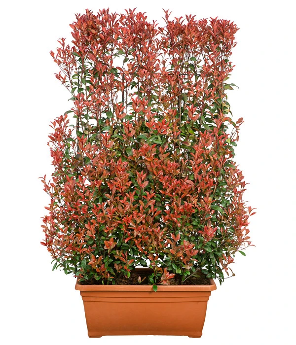 Wie Sie sicherlich bereits gesehen haben, bieten wir Ihnen die Purpur-Glanzmispel ‚Glanzkopf‘ in einem rechteckigen Kübel mit einem Fassungsvermögen von 35 l an. Und weil die Pflanze in der Baumschule bereits an das Wachsen an einem Spalier gewöhnt wurde, haben Sie einen fertigen Sichtschutz, der aus Ihrer Terrasse oder dem Balkon schnell eine blickdichte, private Oase macht.