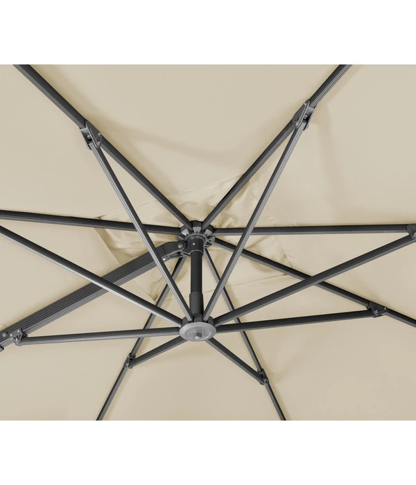 Der Schneider Ampelschirm Rhodos Smart hat ein anthrazitfarbenes, pulverbeschichtetes Gestell aus Aluminium, sodass Sie es unbesorgt draußen im Freien stehen lassen können. Der Sonnenschirm ist außerdem mit einem Kurbelsystem ausgestattet, das Ihnen komfortables und leichtes Öffnen und Schließen des Schirmes erlaubt. Durch Betätigung des Handhebels am Drehgelenk lässt sich der Schirm um 360° drehen, um Ihnen ohne viel Aufwand optimalen Schutz bei fast jeder Sonnenstellung zu geben. Im Lieferumfang zum Schneider Ampelschirm Rhodos Smart ist außerdem ein Plattenständer für 4 Wegeplatten der Größe 50 x 50 cm enthalten, der dem Schirm einen stabilen Stand gibt. Sie müssen also nur die Wegeplatten besorgen und schon ist der Sonnenschirm einsatzbereit.