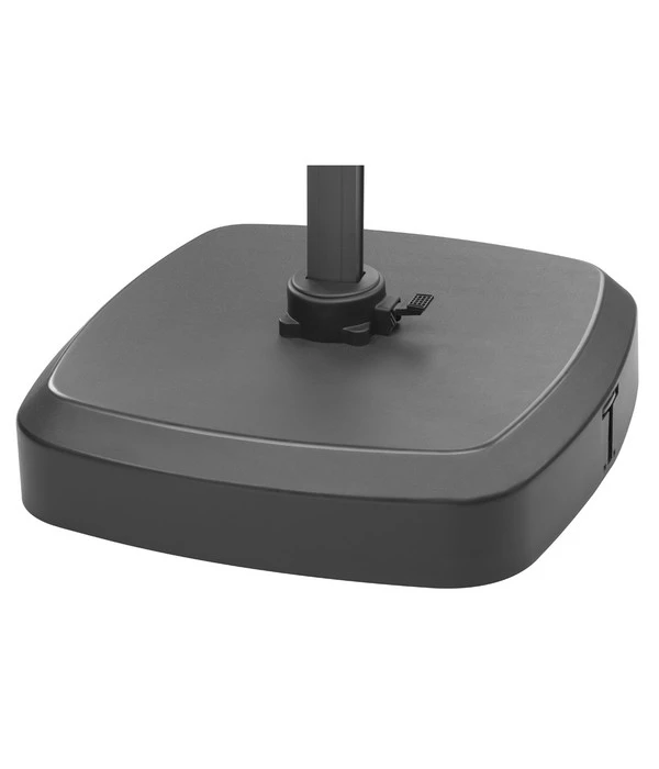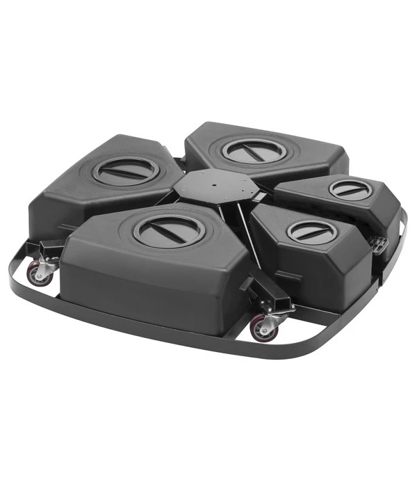 Dank der vier PU-beschichteten Lenkräder ist der Schneider Schirmständer für Ampelschirme sowohl leicht steuerbar als auch ausgesprochen kippsicher. Ein praktisches Fußpedal sorgt für einfache und gefahrlose Hebetechnik. Durch den pulverbeschichteten Stahl verfügt dieser Schirmständer über ein stabiles Fahrgestell und trotzt auch widrigen Bedingungen. Bei den fünf Kunststofftanks sind Sie flexibel in der Wahl des Füllmittels. Ganz wie es Ihnen beliebt, beziehungsweise was Ihnen zur Verfügung steht, sind Sand und Wasser gleichermaßen geeignet. Das Gesamtgewicht beträgt bei leichter Erde ca. 110 kg, bei Flüssigkeit etwa 90 kg. Holen Sie sich den fahrbaren Schirmständer für Ampelschirme von Schneider rechtzeitig, damit Sie den Sommer von Anfang an genießen können.